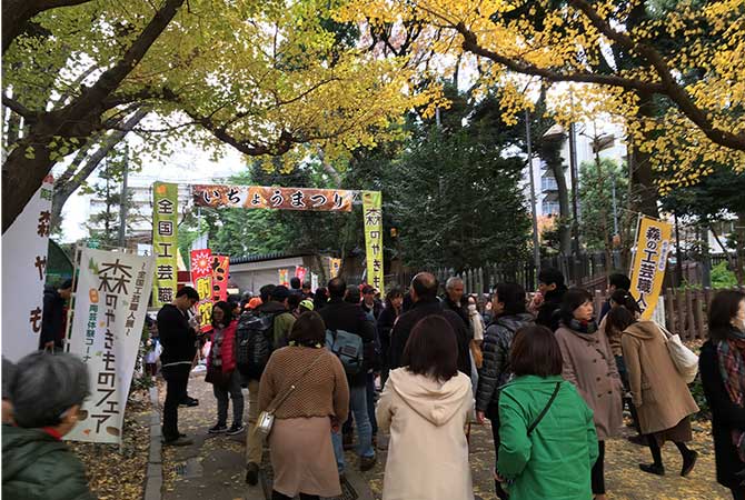 「明治神宮外苑」為東京都內的黃葉景點,以綿延約300公尺的銀杏林蔭大道為人所知。每逢黃葉最佳觀賞時期便會舉辦銀杏祭,活動中將有小吃攤供應精選美食,也有攤位販售匠心獨具的工藝品,還會推出能夠親子同樂的活動,屆時勢必人潮湧動、熱鬧非凡。146棵銀杏林蔭大道形成金黃色隧道,並以宏偉的聖德紀念繪畫館為背景,呈現出堪稱一絕的景色。凋落的黃葉甚至化為覆蓋街道的黃色絨毯,營造出夢幻美感。