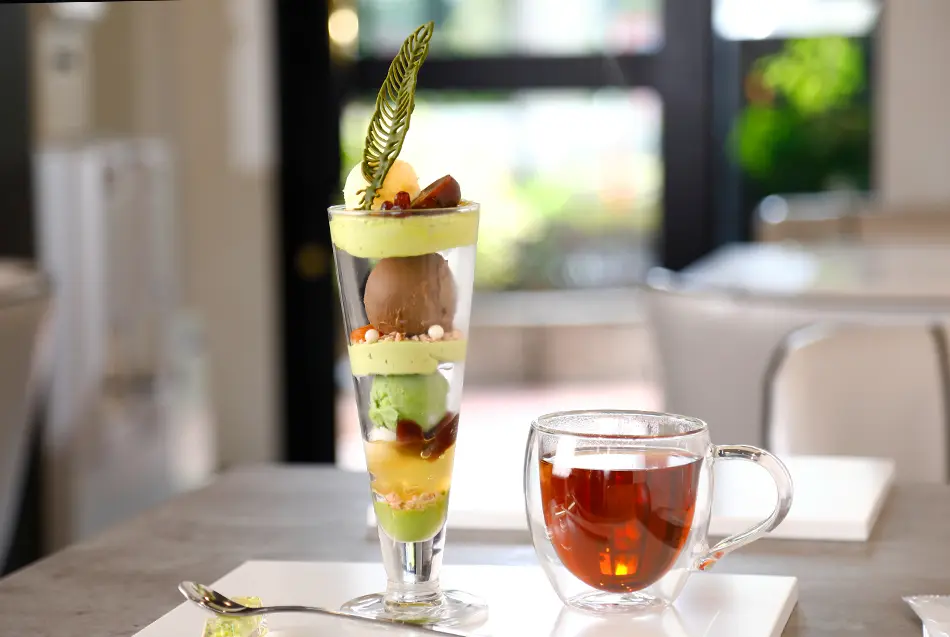 從中午12點開始的「TEA TIME」,即可在這個充滿大人味的空間享受當令水果與日本茶等堆疊出的奢華聖代,採用八女產高級抹茶的抹茶巴斯克起士蛋糕也是濃郁絕選,在職人的巧思下,搭配推薦茶飲,一次體驗茶品多層次變化的趣味。聖代以及甜點的提供時間為平日以及周六:~晚間9點,周日及日本國定假日:~晚間8點。