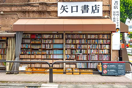 矢口書店創立於1918年,是一家擁有百年以上歷史的神保町古書店。書店外觀保留昭和時代的風情,吸引眾多書籍愛好者和國際知名人士的光臨。現有的建築物是在關東大地震(1923年)後建造的,採用當時流行的「看板建築」風格。臨街的外觀裝飾豪華,以模仿石造的砂漿外牆和山形牆為特徵。店內有高達天花板的書架,豐富收藏了與戲劇和電影相關的古書。在這裡,您還可以找到當時藝人的海報等。矢口書店歡迎外國客人到訪,但如果使用未購買的商品拍照將會被店家予以拒絕。