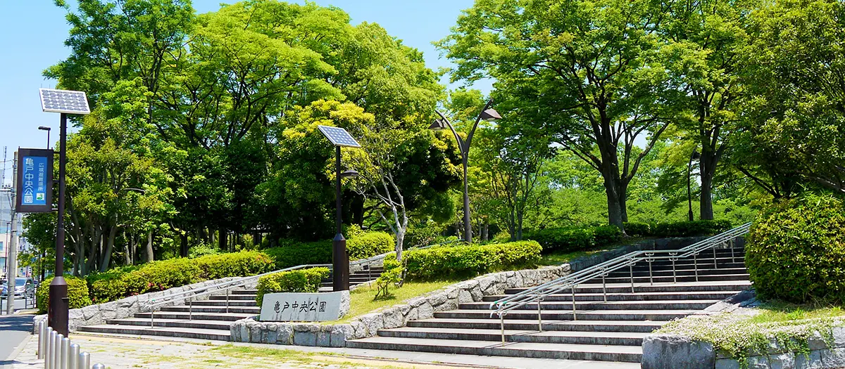 龜戶中央公園位於舊中川西側,是個不分老少皆能盡情享受的公園。園中有多功能廣場、網球場、遊樂場及運動中心。