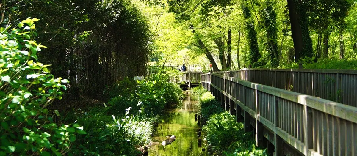 在這座位居郊外的小公園內有條小河,可欣賞到當季綻放的花卉與飛舞的蝴蝶。