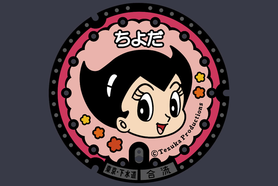 以御茶水站為起點的明大通線,沿線馬路上的下水道人孔蓋設計,以「鐵臂原子小金剛」的卡通形象為主,周邊再點綴上千代田區的代表性圖案櫻花圖案。在作品中,原子小金剛是一名「茶水國小」的學生,而如同父親一般養育他叔父又名「茶水博士」。因此,這一形象與茶水所屬行政區的千代田區有很深的淵源。下水道人孔蓋的款式可分為「原子小金剛」、「烏蘭」和「茶水博士」三種。