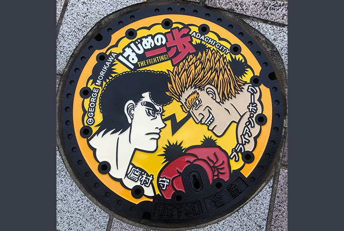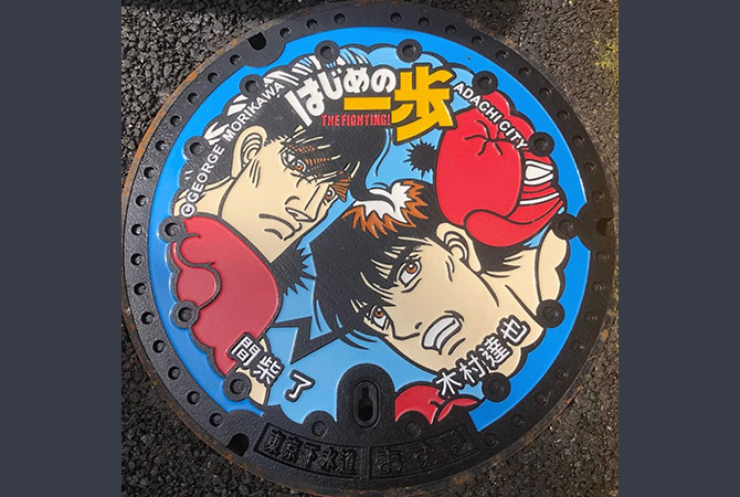 《第一神拳》是足立區出生的漫畫家森川讓次的拳擊漫畫,人孔蓋圖案採用深受粉絲喜愛的夢幻對決(BEST BOUT)場面,由森川讓次親手新繪。第一神拳人孔蓋設置在三個地方,一個在足立區內最大的交通總站──北千住車站,一個在森川讓次的老家梅島當地,一個在西新井(GALAXCITY),因為西新井地區以育兒家庭居多,第一神拳有很多粉絲是這些年代的父母。這三個地方剛好構成一條巡遊路線,讓有心尋訪人孔蓋的粉絲可以順便感受足立區的嶄新魅力。
