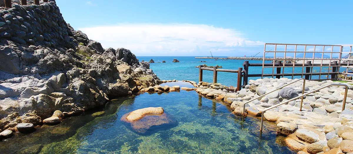 湯濱露天浴池從新島港步行只需5分鐘,建築物本身以希臘為主題,相當醒目。在這裡的露天浴池可以一望美麗海景。更令人興奮的是,這裡不收入浴費。 共有6個大小不同的浴池。空間寬敞,最多可容納約80人同時入浴。最棒的入浴時間大概是夕陽緩緩落入海面時。以些微之差屈居第二的入浴時間則是可以欣賞滿天星斗的晚間。這裡為男女混浴,別忘了穿著泳裝。