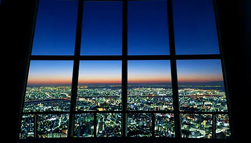 從天望甲板的大片落地窗往外眺望,可以看到360度的美景。前往位於觀景設施低樓層的天望甲板,需要搭乘經過精美裝飾的電梯。只要50秒就能抵達高350公尺的位置。如果想欣賞更高處的景色,歡迎前往觀景設施的高樓層,來到位於450公尺處的天望回廊。雖然從這裡望出去的風景一整天都非常美,但在夕陽西沉,且城市燈火開始點亮時的景象是最浪漫的。