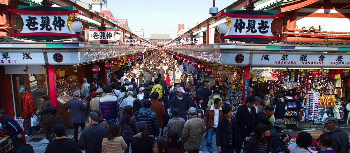 東京最古老的寺廟淺草寺,從雷門到寶藏門的這一段約250公尺的路程便是仲見世商店街。在淺草寺參道的兩旁,林立著約90間店家,各自販售伴手禮、傳統工藝品及輕食等等。