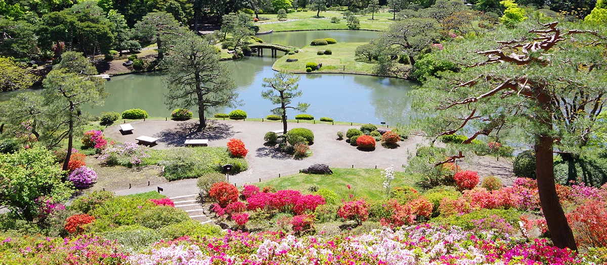 1600年代後半期,杜鵑花在整個江戶(東京的舊稱)成為園藝風潮。六義園至今仍保留著很多當時種植的杜鵑花品種。園內設有對當時的杜鵑花園藝進行解說的面板。讓您在欣賞庭園之美的同時,還能愉快的學習其歷史。六義園艷麗的紅色與粉色杜鵑花交織的美景,在春日暖陽的照耀下將更加出彩。