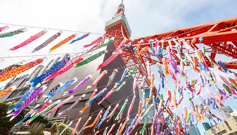 5月5日是日本的「兒童節」。人們習慣在這天掛起鯉魚旗,以祈求孩子健康成長。在高達333公尺的東京鐵塔上,會掛起333幅鯉魚旗;東京晴空塔更會有1,000幅以上的鯉魚旗迎風飄揚。