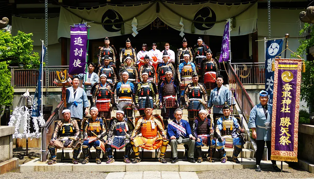 距今約1,100年前,平將門向朝廷舉旗造反。當時,藤原秀鄉(宮廷官僚)在香取神社祈禱後成功鎮壓了叛亂,於是他將弓矢供奉給香取神社以表達謝意,並將其命名為「勝矢」,勝矢祭也由此而來。在5月5日舉行的「勝矢奉納」活動中,可以看到向香取神社整齊行進的武人隊伍。