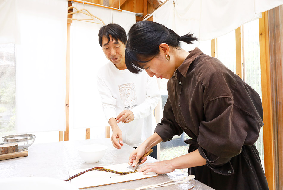 ในกิจกรรมการทำกระดาษ จะได้สัมผัสขั้นตอนอย่างละเอียด กล่าวคือ “การทำกระดาษเริ่มตั้งแต่การทำวัตถุดิบ” โดยจะได้โกนเปลือกต้นหม่อนพลางฟังคำอธิบายจากช่างฝีมือ และเรียนรู้ว่ากระดาษทำมาจากต้นไม้ได้อย่างไร ในกระบวนการทำการ์ดนี้ สามารถเลือกดอกไม้และต้นไม้ด้วยตัวเองเพื่อใส่ลงในการ์ดที่ทำ โดยจะได้โปสการ์ดกระดาษญี่ปุ่น 3 ใบที่ไม่เหมือนใคร แล้วส่งให้เพื่อนหรือใช้เป็นที่คั่นหนังสือของตัวเอง เพื่อถ่ายทอดความอบอุ่นของผลิตภัณฑ์ทำมือจากโตเกียวตะวันตกกันได้เลย