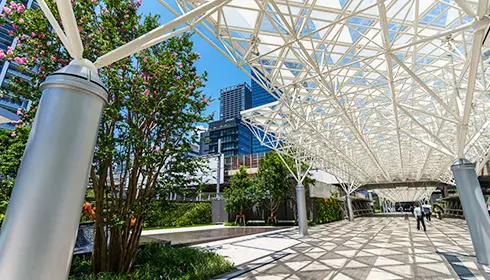 ทางเดินเล่นที่ยั่งยืนแห่งนี้เป็นที่ตั้งของร้านอาหารท้องถิ่นยอดนิยมและธุรกิจนวัตกรรมต่างๆ มากมาย อาทิ ร้านกาแฟที่คั่วกาแฟเอง “Jaho Coffee & Tea”, ร้านอาหารอเมริกันที่ขึ้นชื่อเรื่องเบอร์เกอร์ชั้นเลิศ “ Palm Springs Club “ และบาร์อิตาเลียน “Ortu” ซึ่งใช้พลังงานบางส่วนจากพลังงานไฮโดรเจน แวะซื้อเครื่องดื่มหรืออาหารกลับบ้าน เดินเล่นไปตามแปลงดอกไม้ และพักผ่อนบนม้านั่งร่มรื่น คุณยังสามารถเพลิดเพลินกับการปิกนิกพร้อมรับลมทะเลได้ที่สวนสาธารณะชินฮามะ เขตมินาโตะ ใกล้กับท่าเรือฮิโนเดะ ฝั่งสถานีฮามามัตสึโจ