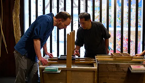 ในเวิร์กชอป 60 นาทีนี้ คุณจะได้รับคำแนะนำในแต่ละขั้นตอน คุณจะใช้เครื่องมือพิเศษที่เรียกว่า ซูเกตะ ตักวัตถุดิบที่ชื้นจากถังน้ำขึ้นมา แล้วโยกไปมาอย่างมีจังหวะ เพื่อให้ได้กระดาษขนาดเท่าโปสการ์ดสี่แผ่นที่เท่ากัน จากนั้นรีดความชื้นออก แล้วนำกระดาษไปตากแห้งบนตะแกรงอบร้อน วัสดุที่ทำจากต้นหม่อนญี่ปุ่นที่เรียกว่า โคโซะ ทำให้กระดาษวาชิมีความนุ่มและคงทนเป็นเอกลักษณ์