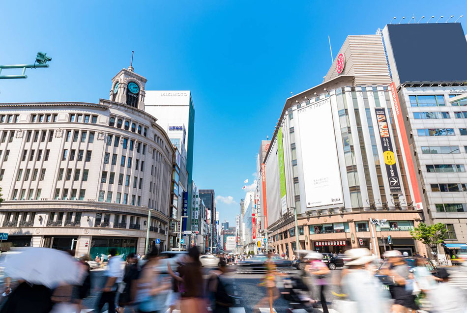 กินซ่าเป็นย่านหรูหราที่หลอมรวมจารีตนิยมและนวัตกรรมเอาไว้ด้วยกัน ตรงถนนสายหลักนั้นมีห้างสรรพสินค้าระดับไฮเอนด์ที่มีชื่อเสียงของญี่ปุ่นตั้งอยู่ และเมื่อเข้าไปในตรอก การช้อปปิ้งร้านบูติกและภัตตาคารเล็กแต่เก๋ไก๋จะกระตุ้นจิตวิญญาณแห่งการผจญภัยขึ้นมา