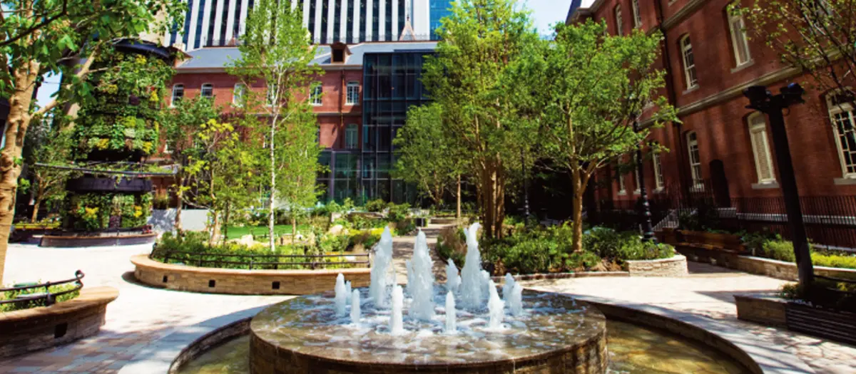 บรรยากาศที่เต็มไปด้วยสีเขียวของต้นไม้ที่อยู่ในซอกตึกสูงระฟ้าในมารุโนะอุจิ