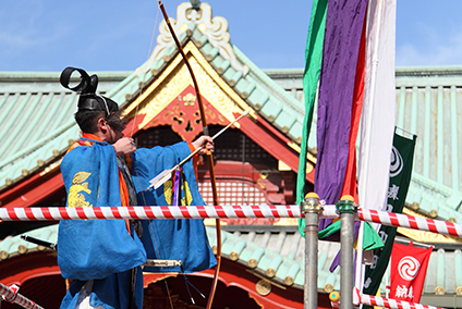 ศาลเจ้าคันดะเมียวจินยังเป็นที่รู้จักในฐานะศาลเจ้าผู้พิทักษ์ประตูทิศตะวันออกเฉียงเหนือของปราสาทเอโดะ (ซึ่งตามความเชื่อดั้งเดิมถือว่าเป็นทิศแห่งโชคร้าย) ก่อนจะเริ่มพิธีปาถั่วจะมีการจัด "เมเกง โนะ กิ" (พิธีดีดสายธนู) โดยนักบวชที่แต่งกายในชุดนักรบโบราณ ซึ่งเป็นการแสดงท่ายิงธนูไปทางทิศตะวันออกเฉียงเหนือ (คิโมง: ทิศอัปมงคล) และทิศตะวันตกเฉียงใต้ (อุระคิโมง: ทิศอัปมงคลด้านหลัง) ในพิธีปาถั่วจะมีบุคคลต่างๆ ที่มีชื่อเสียงปาถั่วจากทางเดินที่จัดไว้เป็นพิเศษ