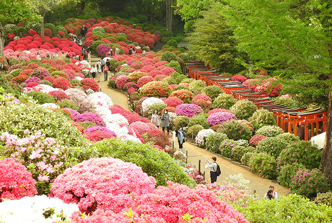 ตำนานเล่าว่าศาลเจ้าเนซุก่อตั้งโดยเจ้าชายชื่อยามาโตะทาเครุเมื่อกว่า 1,900 ปีที่แล้ว ศาลเจ้าเนซุซึ่งมีประวัติศาสตร์ยาวนานถึง 300 ปี ครอบคลุมพื้นที่ 6,600 ตารางเมตร และเป็นแหล่งปลูกดอกกุหลาบพันปีราว 3,000 ต้นจาก 100 สายพันธุ์ ในบรรดานั้นมีพันธุ์ที่หายากด้วย เช่น ฟุจิสึสึจิ (ขนาดเล็กเท่าเมล็ดถั่วเมื่อบานสะพรั่ง), ฮานะงุรุมะ (บานเป็นรูปร่างเหมือนกังหันลม) และคาราฟุเนะ (กุหลาบพันปีสีดำ) นอกจากดอกไม้แล้ว ยังสามารถเพลิดเพลินไปกับตลาดต้นไม้ และนิทรรศการพิเศษที่จัดแสดงภาพวาดสามสิบหกบทกวีอมตะของญี่ปุ่นอีกด้วยช่วงระยะเวลาที่เปิดให้ชมพิเศษนี้แบ่งเป็นรอบ 12:00 น. และ 14:00 น. รอบละ 20 นาที อาคารทั้ง 7 หลังรวมถึงอาคารหลักของศาลเจ้า ได้รับกำหนดให้เป็นมรดกทางวัฒนธรรมที่สำคัญของชาติ